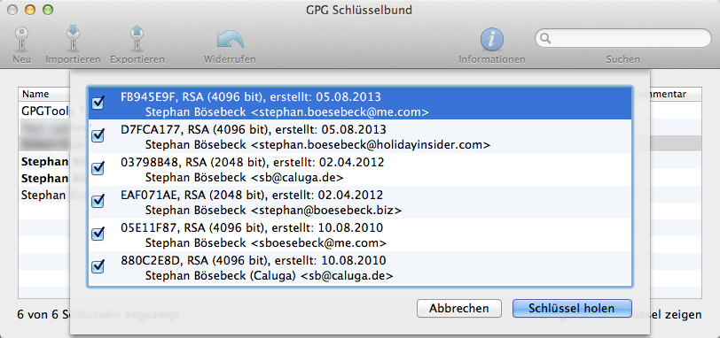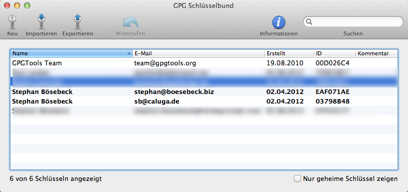 Tipp: Falls man schon eine GPG Installation z.B. unter Linux hat oder auf einem anderen Unix, kann man das Verzeichnis ~/.gpg einfach auf den Mac übertragen und hat automagisch seine gesammelten Keys auch hier zur Verfügung