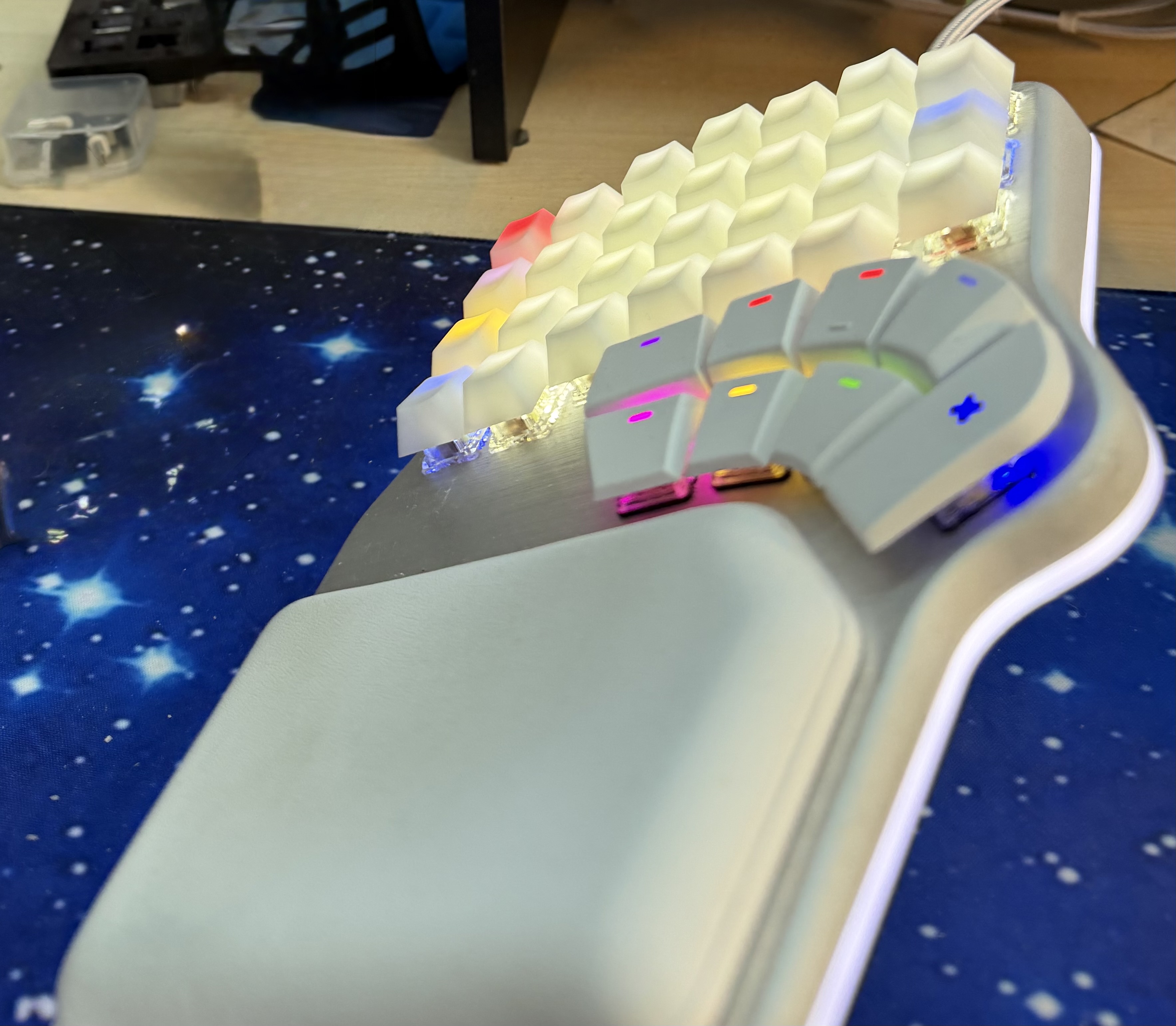 Hot-swap is one of those features you don't realize how great they are until you have them. Over the 12 months, I've tried quite a few: Started with Gateron Brown Silent (quiet, tactile, office-friendly) and Gateron White Clicky (loud and satisfying). Then came Boba switches, and currently at home I have really nice thocky loud switches whose name I honestly can't remember. At the office, it's the Gateron Brown Silent again β€” because as much as I love the clacking, my colleagues see it differently. The point is: you can just change the character of the keyboard. Different switch, different typing feel, different mood. That sounds like a gimmick, and it probably is β€” but it's fun.