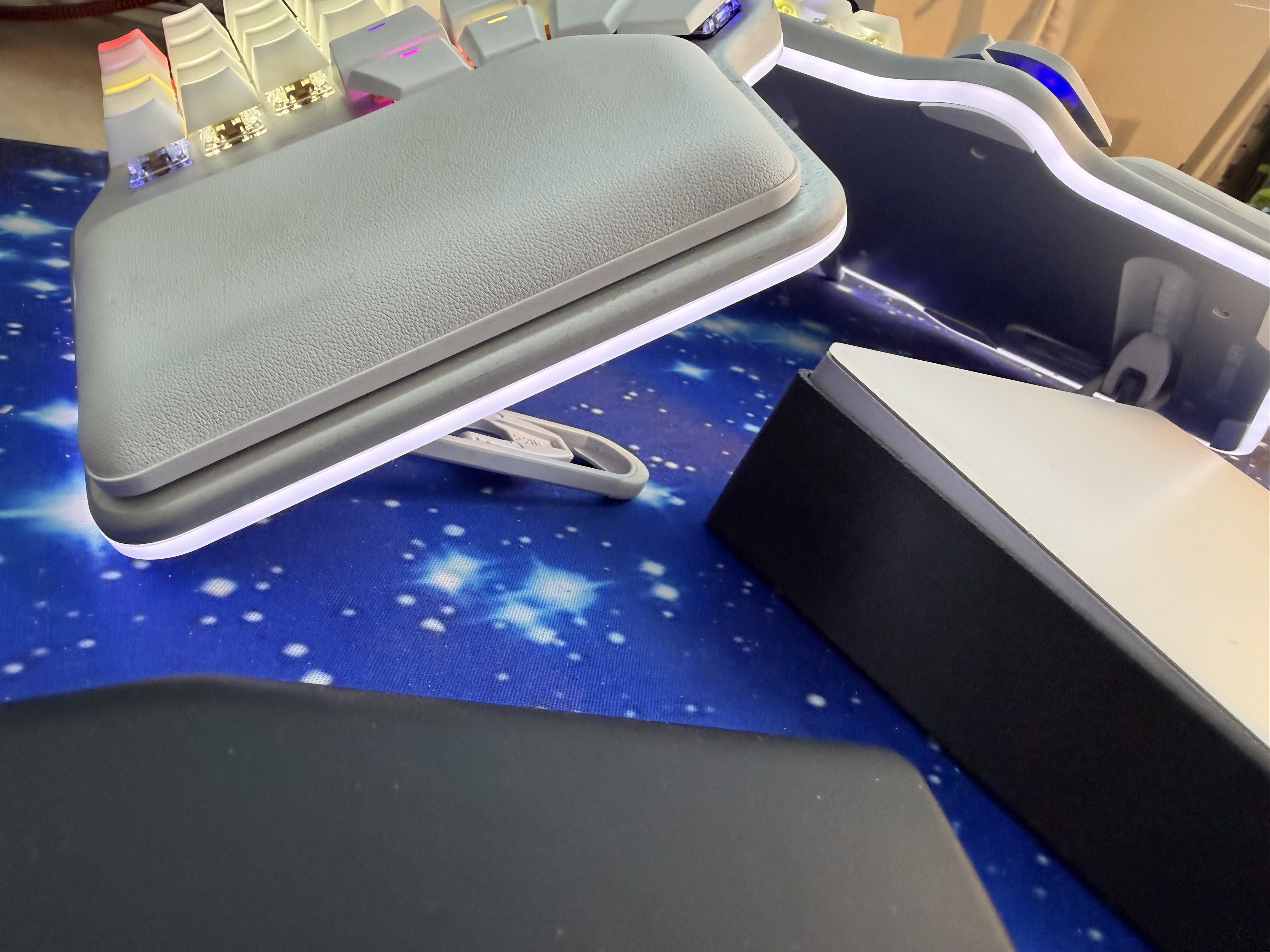 However: If you go steeper than 25 degrees, it gets wobbly. That's where the included solution reaches its limits. I'm considering 3D-printing something custom β€” a sturdier mount that allows steeper angles. I don't have the right idea yet, but the project is floating around in the back of my mind. There are other solutions involving various stands, but those need to be clamped or screwed to the desk somehow. Not really my thing right now, and too inflexible. But tenting alone wasn't the only factor. Another reason was the constant struggle with too few keys (at least for me). That kept bugging me, and constantly switching between layers gets annoying. A really nice feature is the Bluetooth connectivity. It's great β€” I can connect my Defy via Bluetooth to the iPad and via cable to the Mac, and switching between them works perfectly. That's simply not possible with the Keyboardio. Also, the two halves of the Defy not needing a cable between them is nice. It didn't bother me that much before, but without it is definitely nicer. πŸ˜‰ And one of the Model 100's advantages is the cool quasi "curved" arrangement of the specially shaped keycaps. That feels great when typing (unless the keys are worn down), but unfortunately you can only use Keyboardio's own keycaps. That's annoying. Please don't get me wrong: the Model 100 is an amazingly great keyboard! I'd recommend it to anyone looking for a split keyboard. But if you want to take it up a notch, the Defy is simply better.